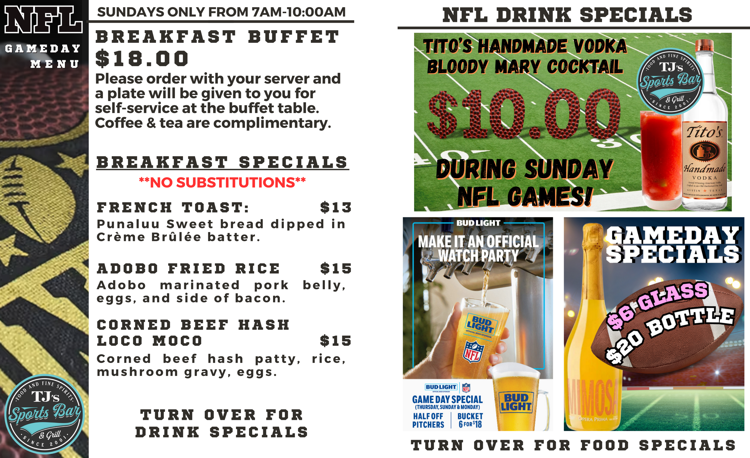 HAPPY HOUR SPECIALS -events - food pics - new stuff FOOD MENU DRINK MENUS LATE NITE POWER HOUR 11PM-12AM MON-THUR SAUCE DELIVERY & ONLINE ORDERING LINK GRUBHUB ONLINE ORDERING LINK RESERVATION REQUEST FORM CATERING Menus TO ORDER GIFT CARDS ONLINE TJ’s SPORTS BAR and GRILLCall us: 808-545-2424Open at 10:00am Monday-Friday Open at 2:00pm Saturday & 7am Sunday (NFL)Email us at: admin@tjshawaii.comLocally owned and operated, because beer and whiskey won’t drink themselves.